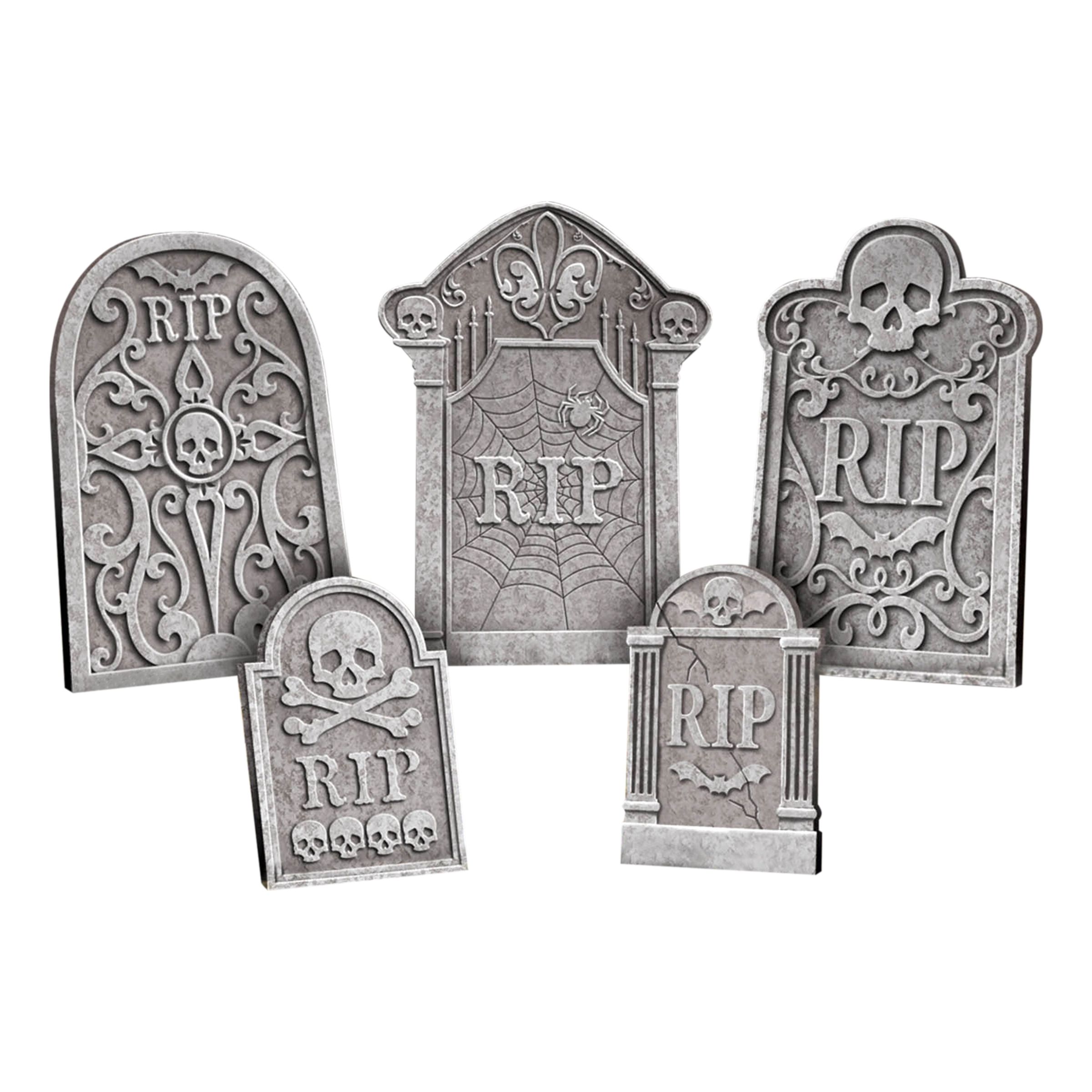 Gravstenar Dekorationskit innehåller 5 stycken gravstenar där de stora mäter 57 cm och de mindre mäter 28 cm. Kusliga dekorationer för mörka halloweennätter!
