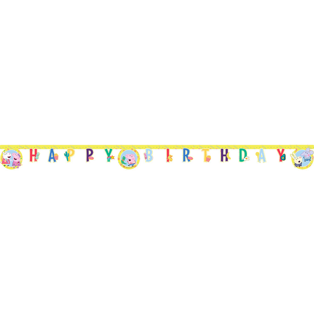 Greta Gris Kalas Happy Birthday Girlang omfattar en bokstavsgirlang i papp med texten "Happy Birthday" och motiv av Greta Gris med vänner i olika färger på gulgrön bakgrund. Girlangen är ca 2 meter lång och motiven är ca 15,5 cm höga och 16 cm breda. Hängs upp med vitt snöre.