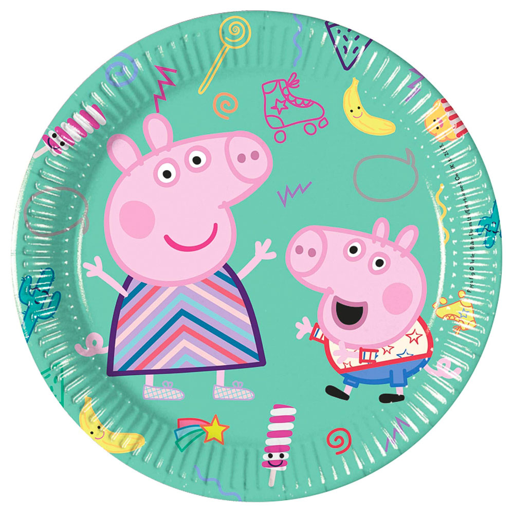 Greta Gris Kalas Pappersassietter omfattar åtta turkosa assietter med Greta Gris och Georg samt blandade motiv i olika färger och former. Assietterna är tillverkade i papp och är ca 19,5 cm stora.