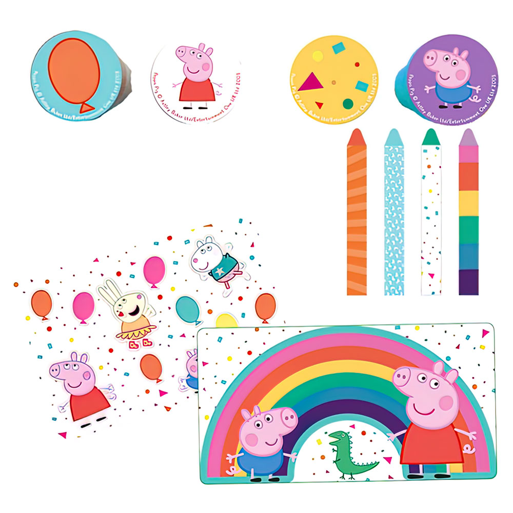 Greta Gris Målarset 4-pack är ett kit med olika roliga leksaker att dela ut på kalaset. Setet omfattar 4 stycken uppsättningar av stämpel, kritpaket, ett litet målarblock och ett ark med klistermärken.
