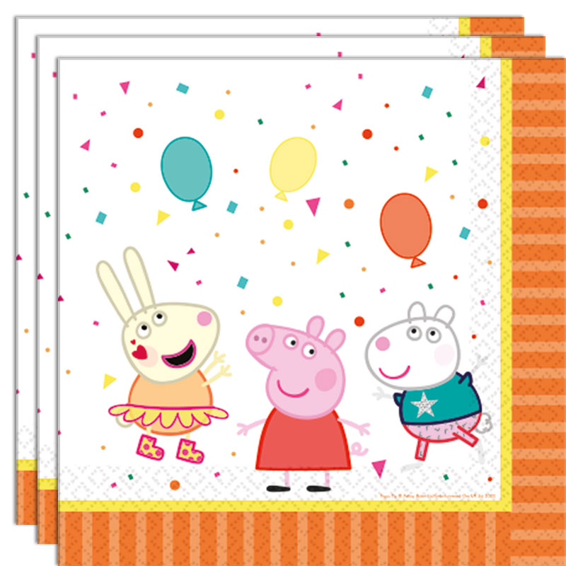 Greta Gris Servetter innehåller vita servetter med orange kanter samt färgglatt Greta Gris motiv.