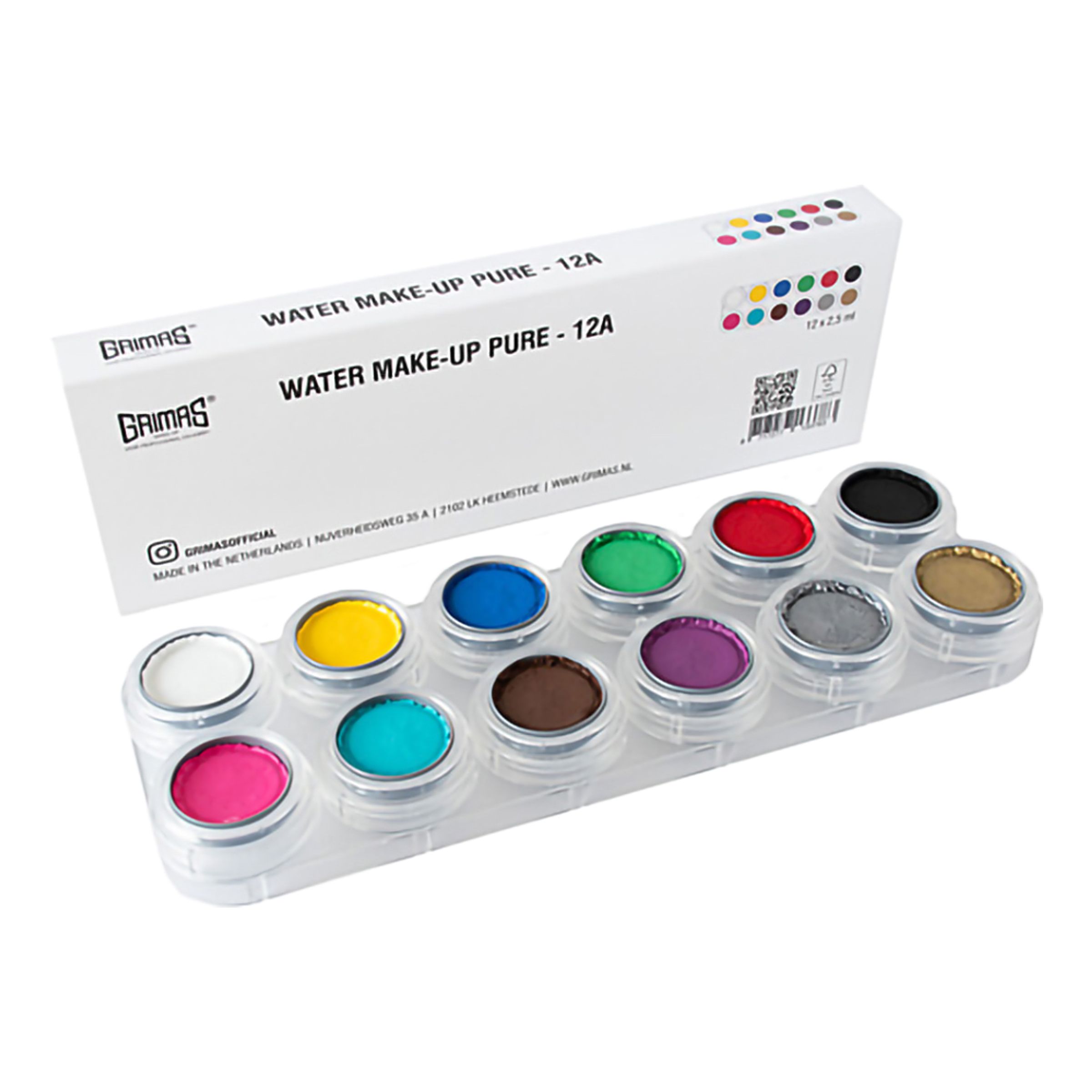 Grimas Ansiktsfärger Set är oparfymerad, glutenfri och vattenbaserad färg avsedd för ansikts- och kroppsmålning. Färgerna går utmärkt att blandas med varandra och tvättas enkel bort med hjälp av två och vatten. Sminket är lämpligt för barn.