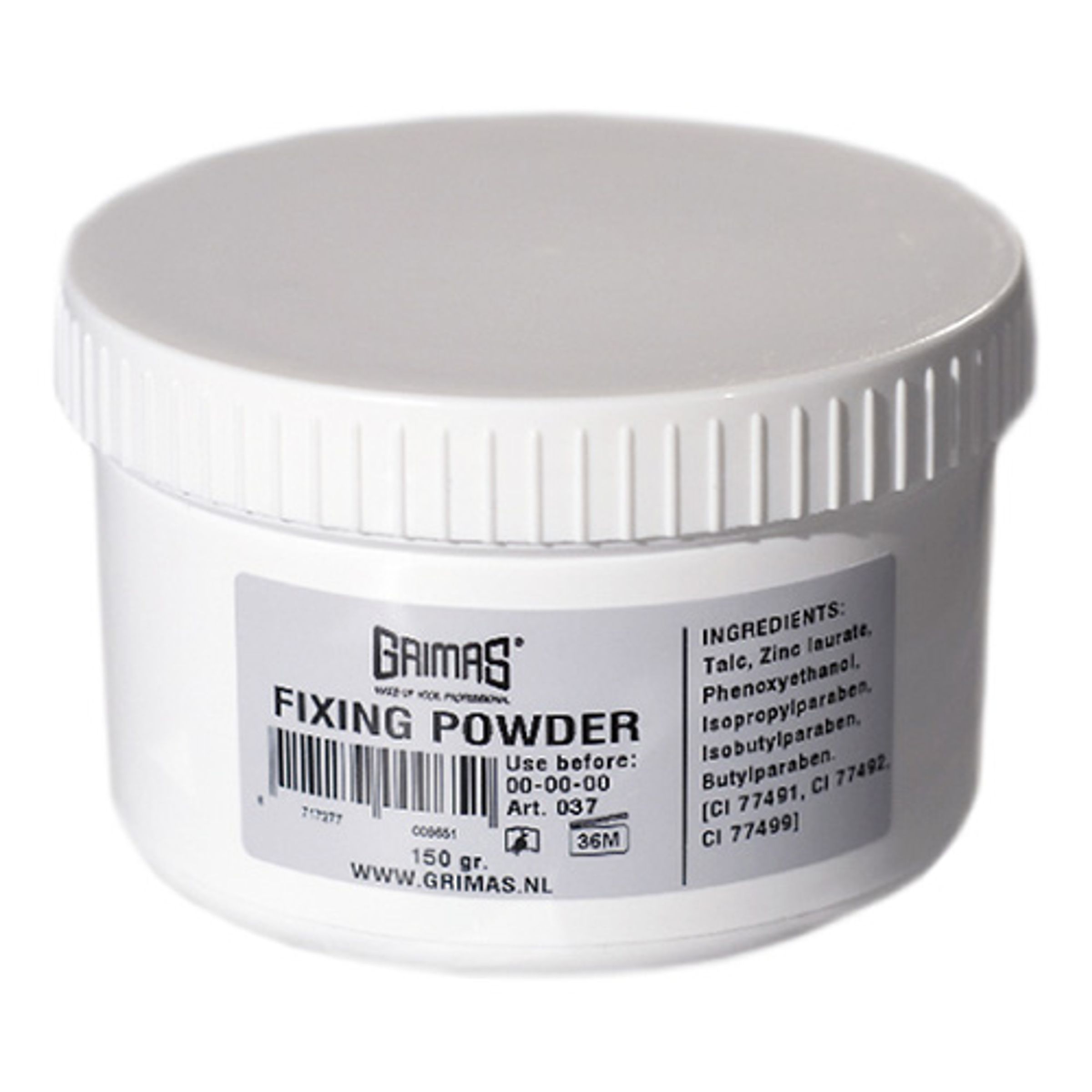 Grimas Fixeringspuder Foundation och Läppstift är en burk löst, transparent och vattenavvisande puder som används för att fixera foundation och läppstift. Eftersom pudret är genomskinligt påverkar det inte färgen under men det kan ge en uppljusande effekt.