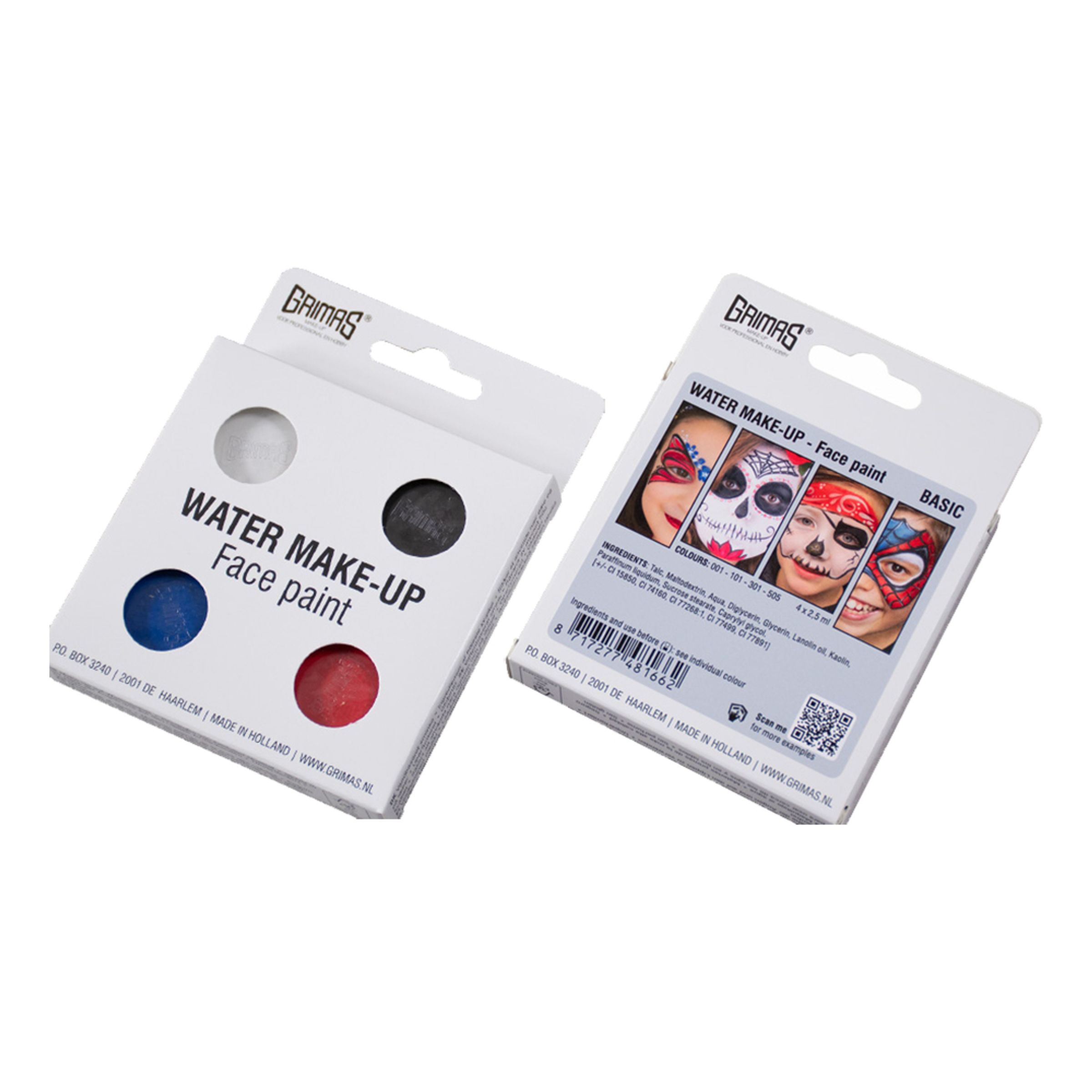 Grimas Sminkset Basic är ett sminkset med vattenbaserad ansiktsfärg som inkluderar färgerna: Vit (001), svart (101), blå (301) och röd (505). Färgen är oparfymerad, glutenfri, skonsam mot hud och torkar inom 15 sekunder. Tvättas bort med vatten. Passar både barn och vuxna.
