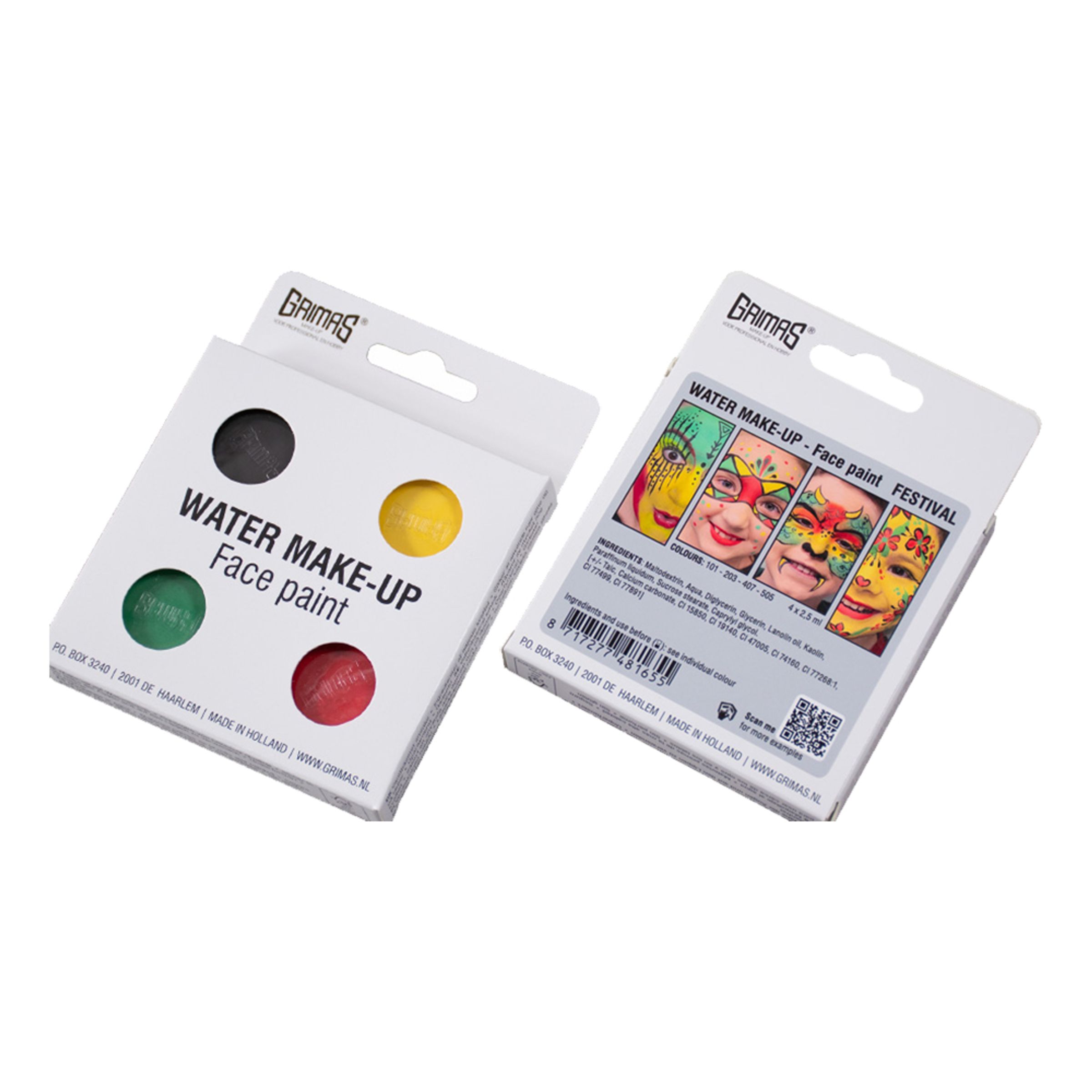 Grimas Sminkset Festival är ett sminkset med vattenbaserad ansiktsfärg som inkluderar färgerna: svart (101), gul (203), grön (407) och röd (505). Färgen är oparfymerad, glutenfri, skonsam mot hud och torkar inom 15 sekunder. Tvättas bort med vatten. Passar både barn och vuxna.