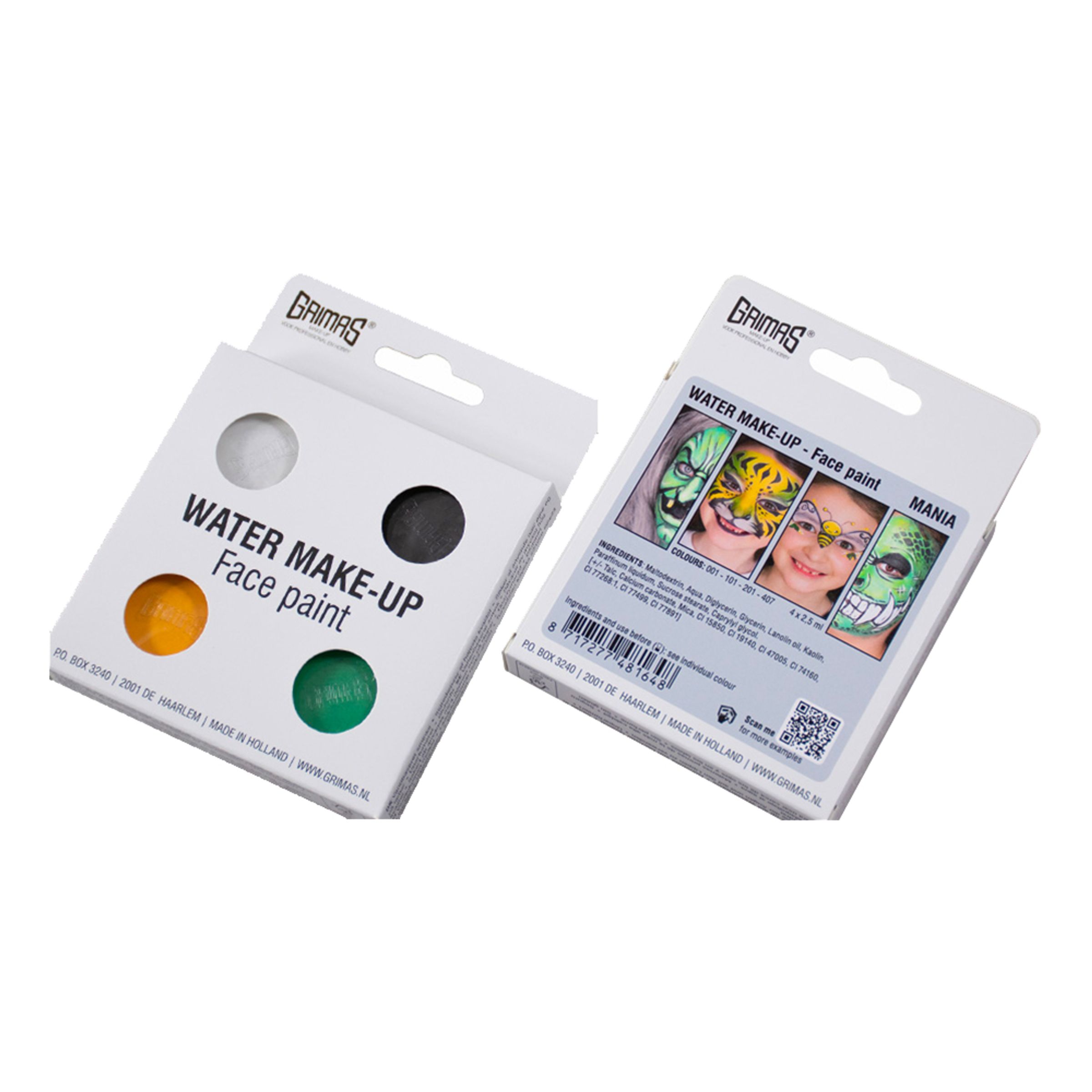 Grimas Sminkset Mania är ett sminkset med vattenbaserad ansiktsfärg som inkluderar färgerna: Vit (001), svart (101), gul (201) och grön (407). Färgen är oparfymerad, glutenfri, skonsam mot hud och torkar inom 15 sekunder. Tvättas bort med vatten. Passar både barn och vuxna.
