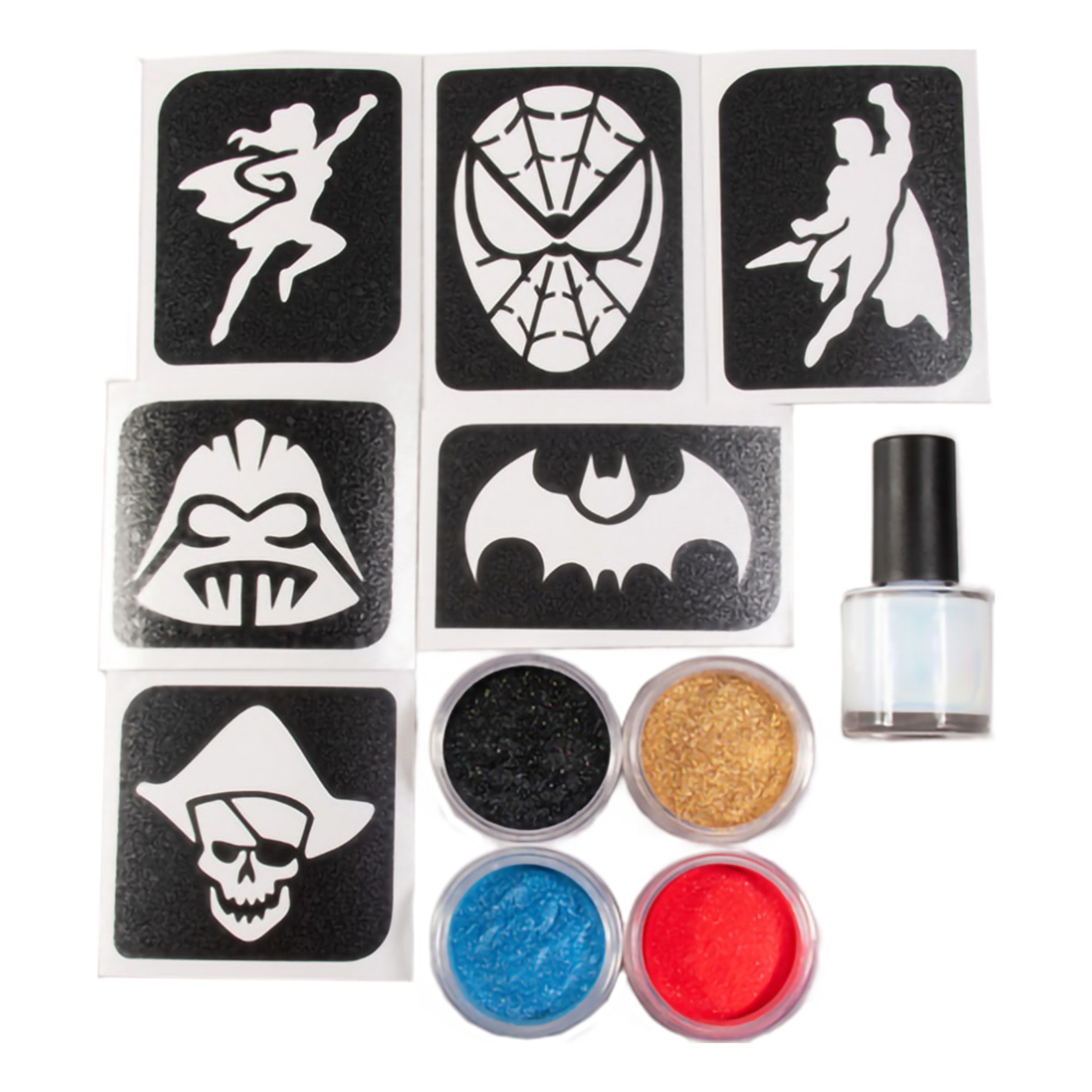 Att göra sig häftig inför superhjältekalaset behöver inte vara krångligt! Använd bara det här smidiga tatueringssetet så får både armar och kinder ett glittrande lyft i form av valfri hjälte-ikon!