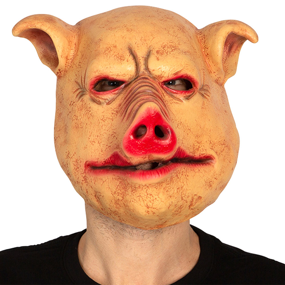 Grismask Latex omfattar en läskig halloweenmask i latex som föreställer ett grishuvud. Masken täcker hela huvudet och har hål för ögon, näsa och mun.