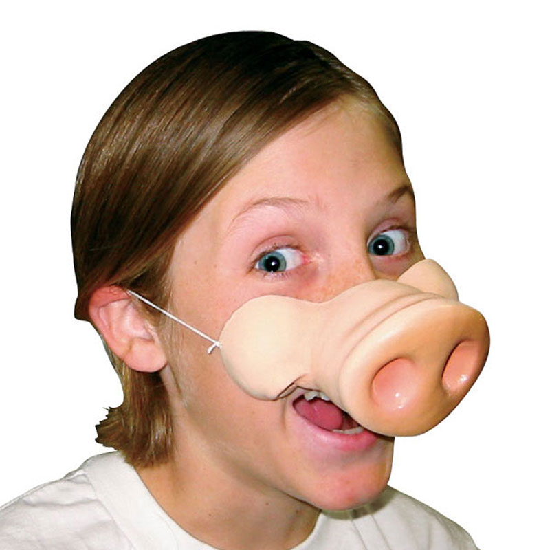 Grisnäsa är beige och gjord i gummi-material. Du fäster lätt din grisnäsa med hjälp av medföljande resårband.