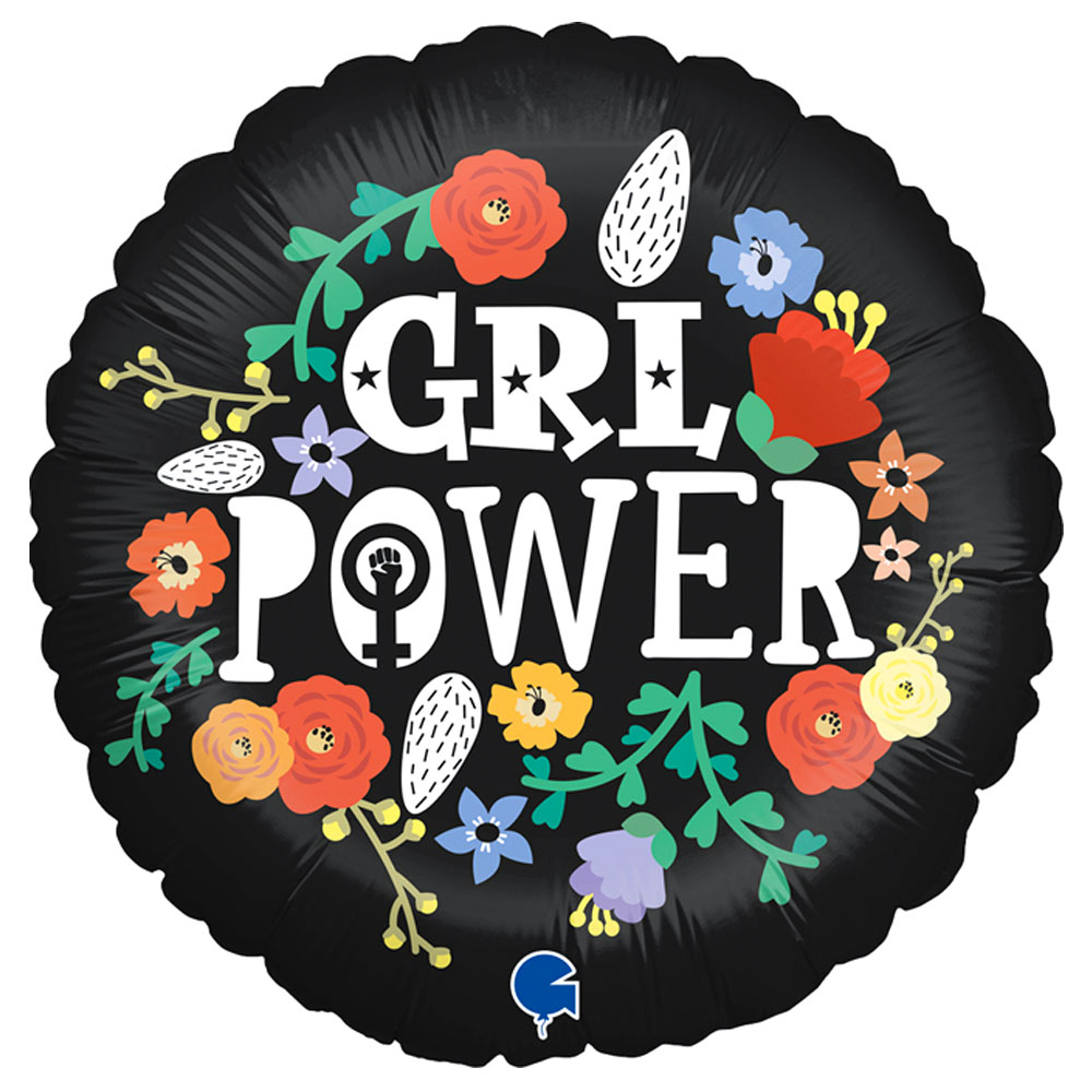 Grl Power Folieballong omfattar en rund svart ballong med motiv av färgglada blommor samt texten "Grl Power" i vitt. Ballongen fylls med luft eller helium och mäter ca 46 cm i diameter uppblåst. Ballongen svävar i ca 7 dagar med helium.