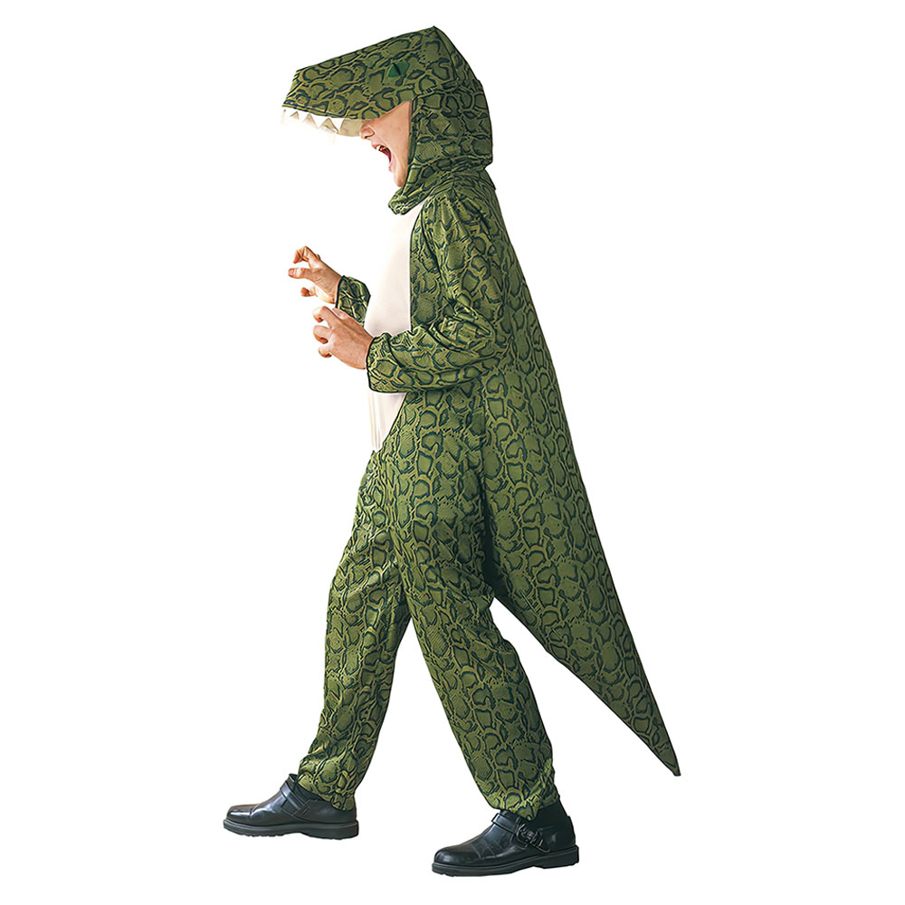 Barn Dinosauriedräkt omfattar en jumpsuit med huva och svans i grönt dinosauriefjäll med beige färg på magen. Dräkten är gjord i 100% polyester.