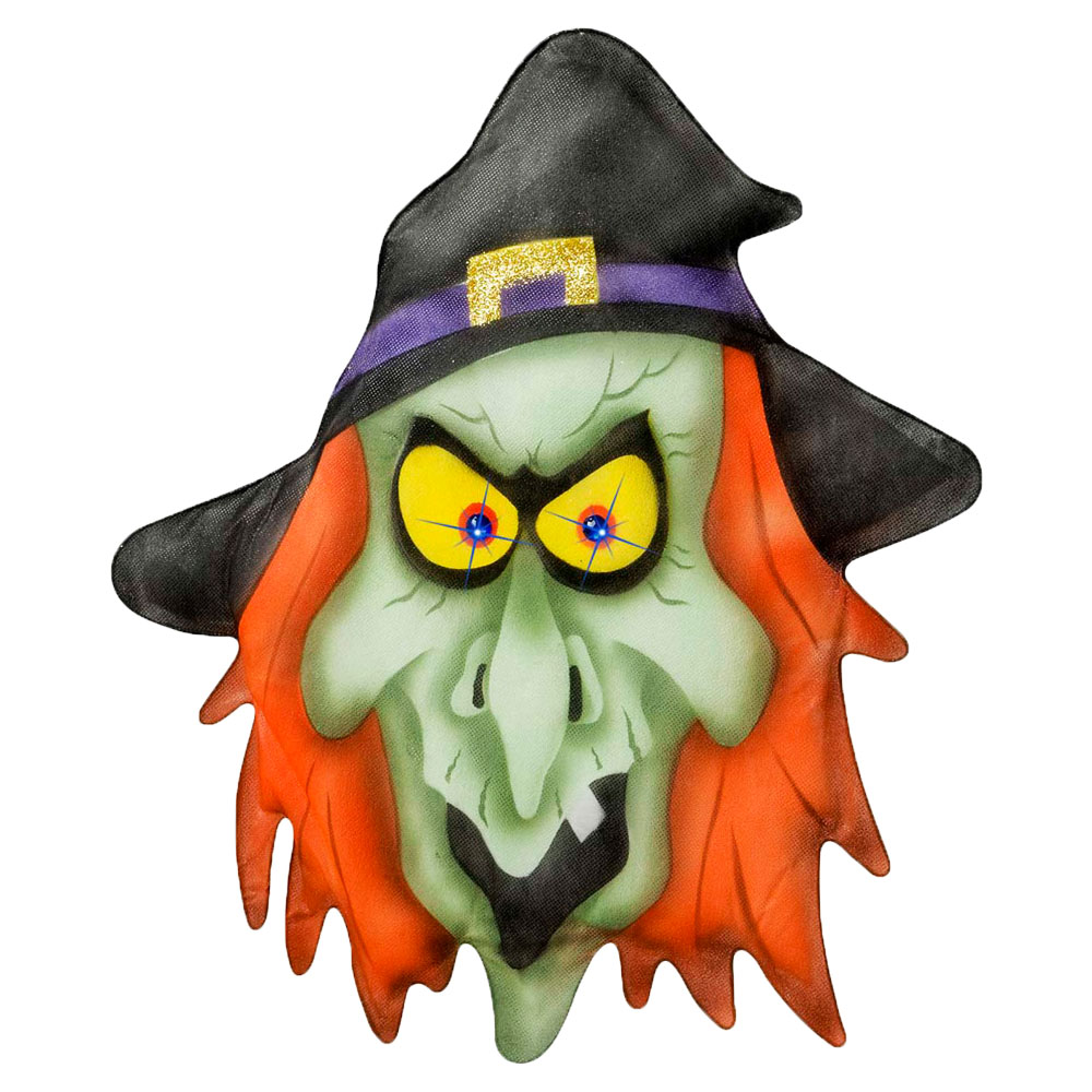Grön Häxa Dekoration omfattar en dekoration i form av en grön häxa med glittrande ögon. Häxan är tillverkad av plast och polyester och är ca 33 cm bred samt 57 cm lång.
