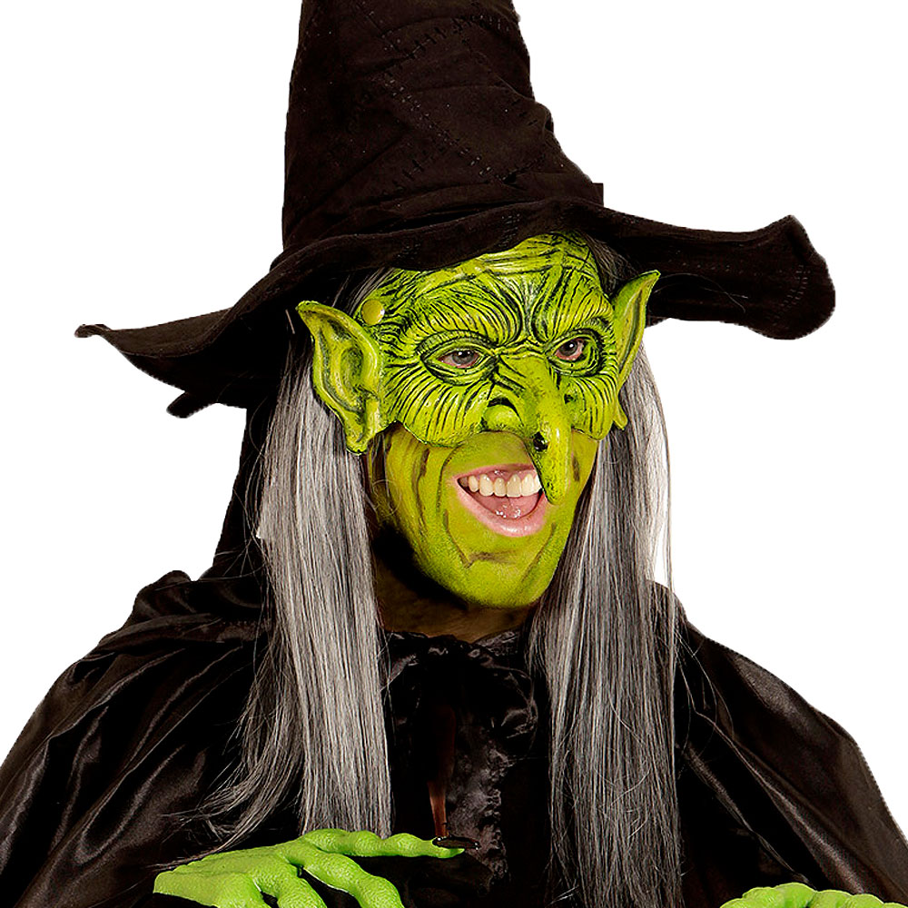 Grön Häxmask omfattar en grön häxmask med utstickande näsa och öron. Masken täcker halva ansiktet och passar vuxna. Tillverkad av latex och skummaterial.