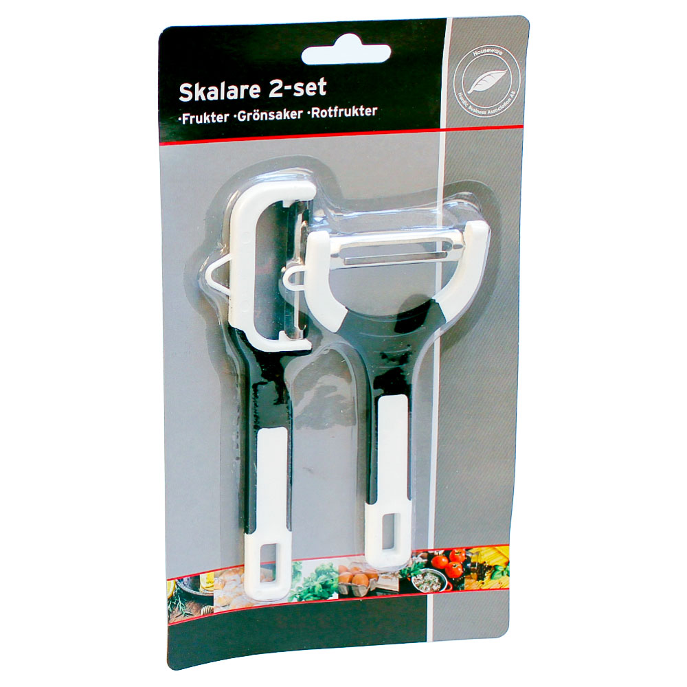 Grönsaksskalare består av skalare som skalar eller tunt skivar frukt, grönsaker och rotfrukter. Skalarna mäter ca 13-15 cm i längd. Tillverkade i plast och rostfritt stål. Säljs i 2-pack.