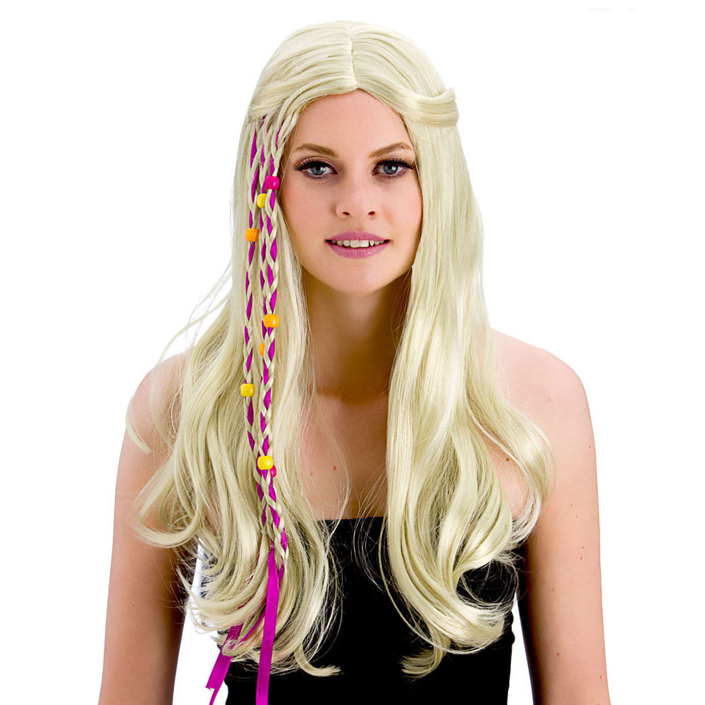 Groovy Hippie Peruk Blond omfattar en lång, lätt lockig peruk i en fin blond nyans. Peruken har mittbena och är även utsmyckad med ett par slingor med pärlor i olika färger.