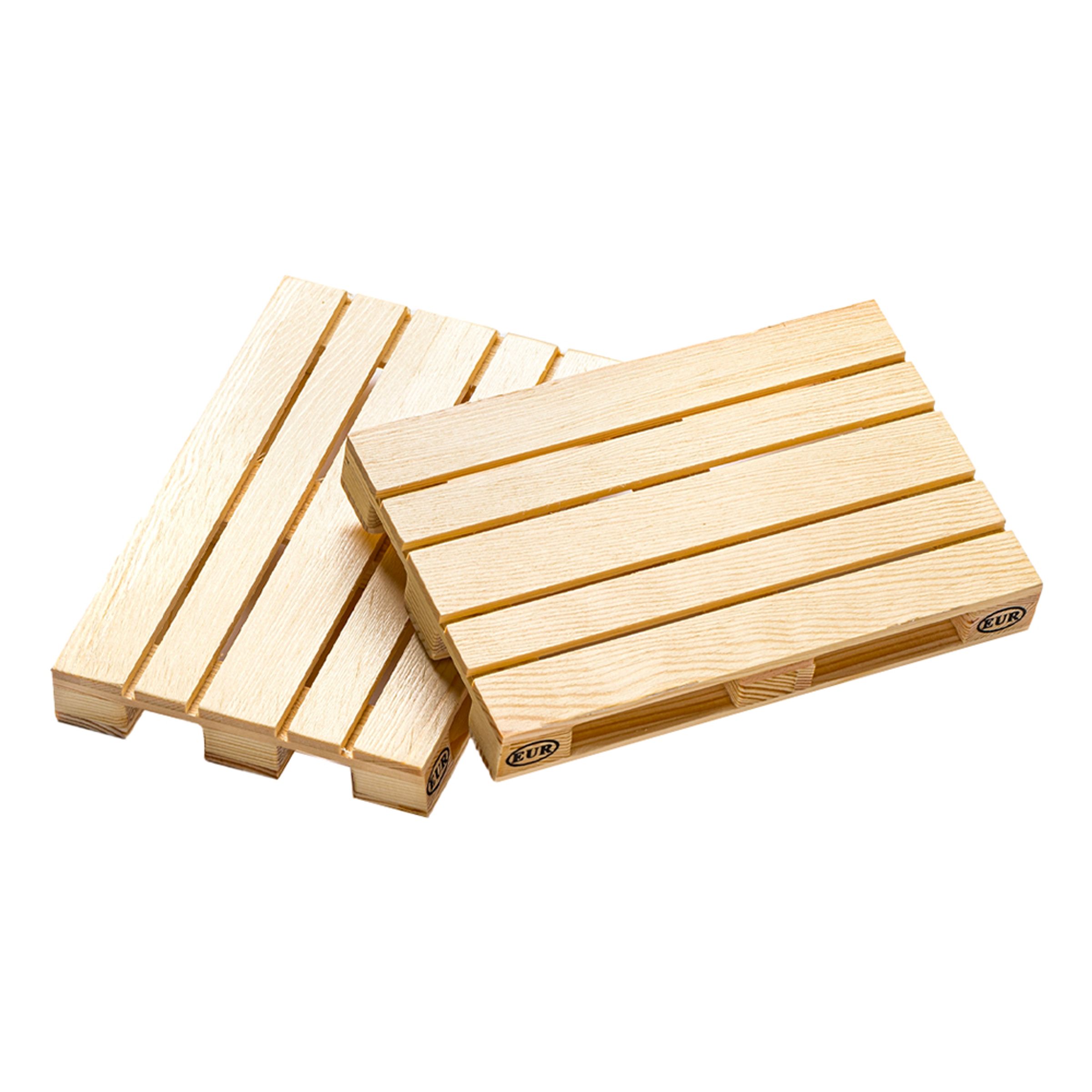Grytunderlägg Lastpallar består av två stycken lastpallar i miniatyr. Perfekt att ställa ut på bordet när du vill skydda bänkskivan mot oönskade märken!