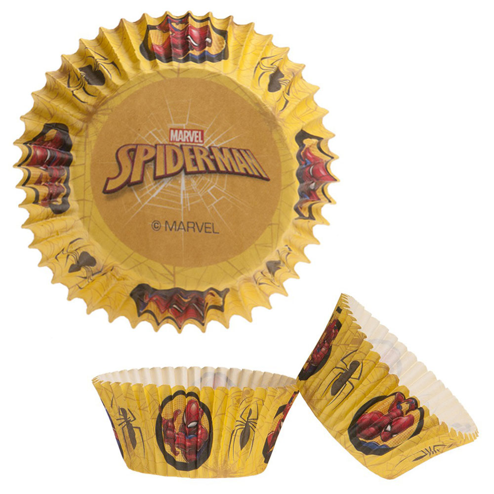 Gula Spiderman Muffinsformar innehåller 25 stycken gula muffinsformar med motiv av Spiderman, spindlar och Spiderman loggan. Formarna tål upp till 220 grader. Tillverkade av papp.
