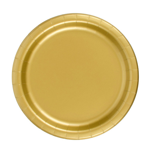 Guld Assietter omfattar ett 20-pack guldiga engångsassietter av papp som mäter ca 18 cm i diameter.