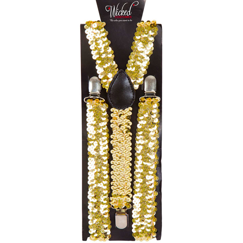 Guld Hängslen Paljetterad omfattar ett par töjbara, guldpaljetterade hängslen med metallspännen som du enkelt fäster i byxorna. Hängslena är fullt justerbara för en bra och komfortabel passform.