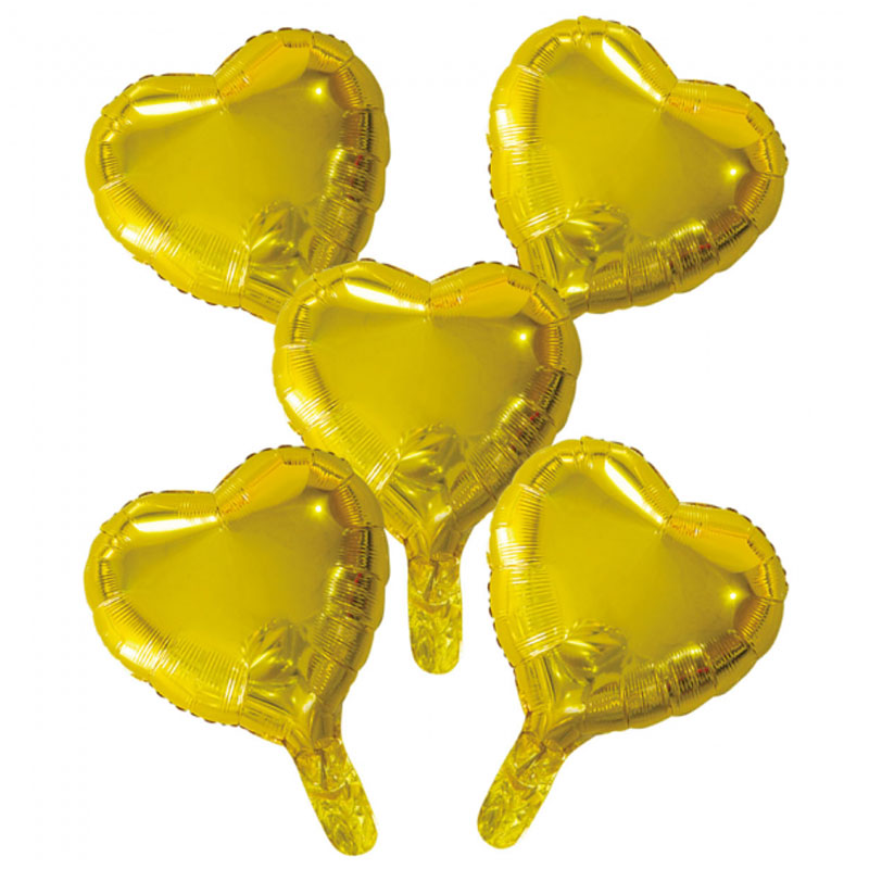 Guld Hjärtballonger 5-pack består av 5 stycken hjärtformade folieballonger i en skimrande guld, samt ett papp-rör som underlättar när du ska blåsa upp ballongerna. Ballongerna är självförslutande och ska endast fyllas med luft. Mått: 23 x 23 cm. Säljs i 5-pack.