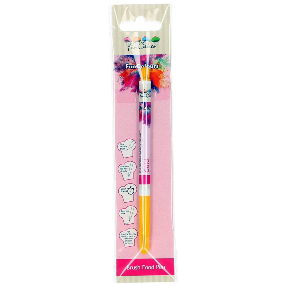 Guld Penna med Ätbar Färg är en penna som går att användas direkt på torra, hårda eller halvhårda jämna ytor som marsipan, fondant m.m. Penna har guldigt ätbart bläck samt en mjuk och smidig borstspets.