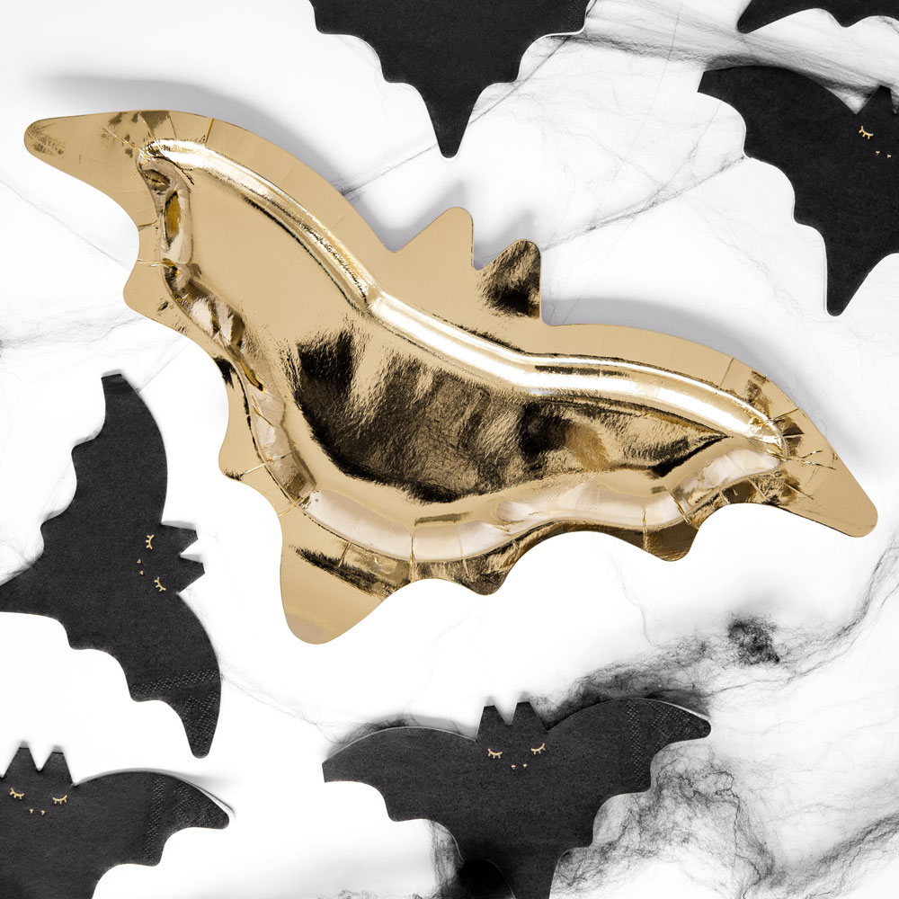 Guldiga Fladdermöss Tallrikar innehåller guldiga engångstallrikar som föreställer fladdermöss med utsträckta vingar. Tillverkade i papp.