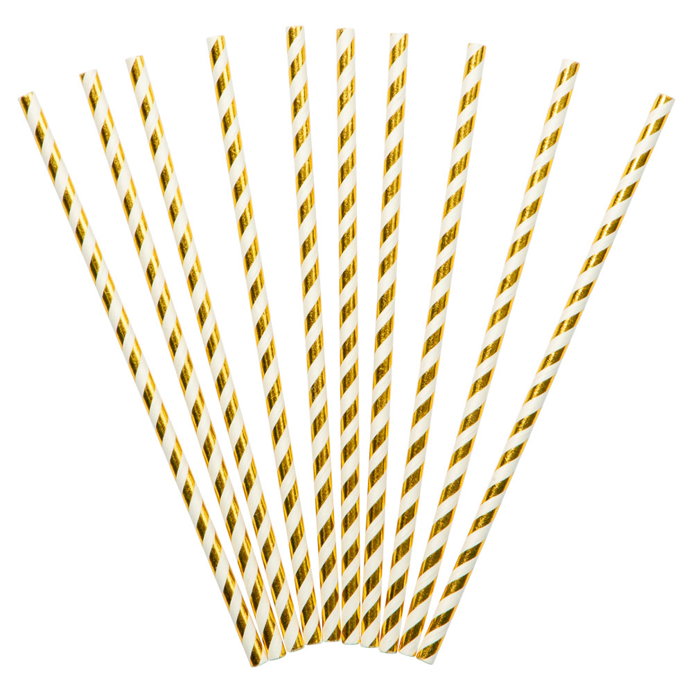 Guldiga Sugrör Randiga omfattar 10 st pappsugrör med ränder i vitt och guld. Sugrören mäter ca 19,5 cm långa.
