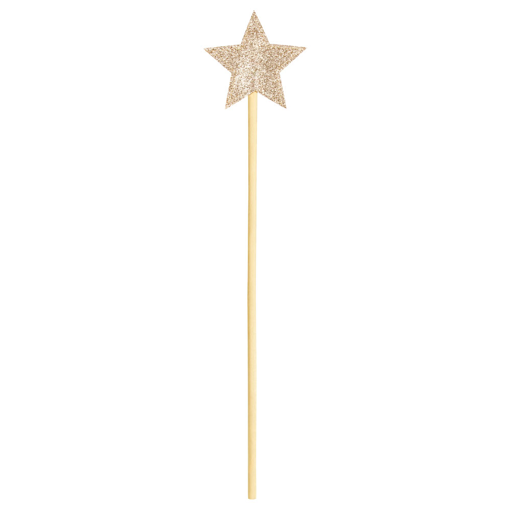 Guldigt Trollspö omfattar ett guldigt trollspö med glittrig stjärna på toppen. Trollspöt är tillverkat av plast och polyester, och är ca 37,5 cm långt.