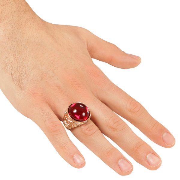 Med en maffig ring på fingret får du enkelt till en snygg detalj till utklädnaden. En häftig, guldfärgad ring med stor, röd diamant som lämpar sig utmärkt till maskerad och halloween. Perfekt för dig som söker passande halloween smycken till exempelvis pirat eller vampyr utklädnaden.