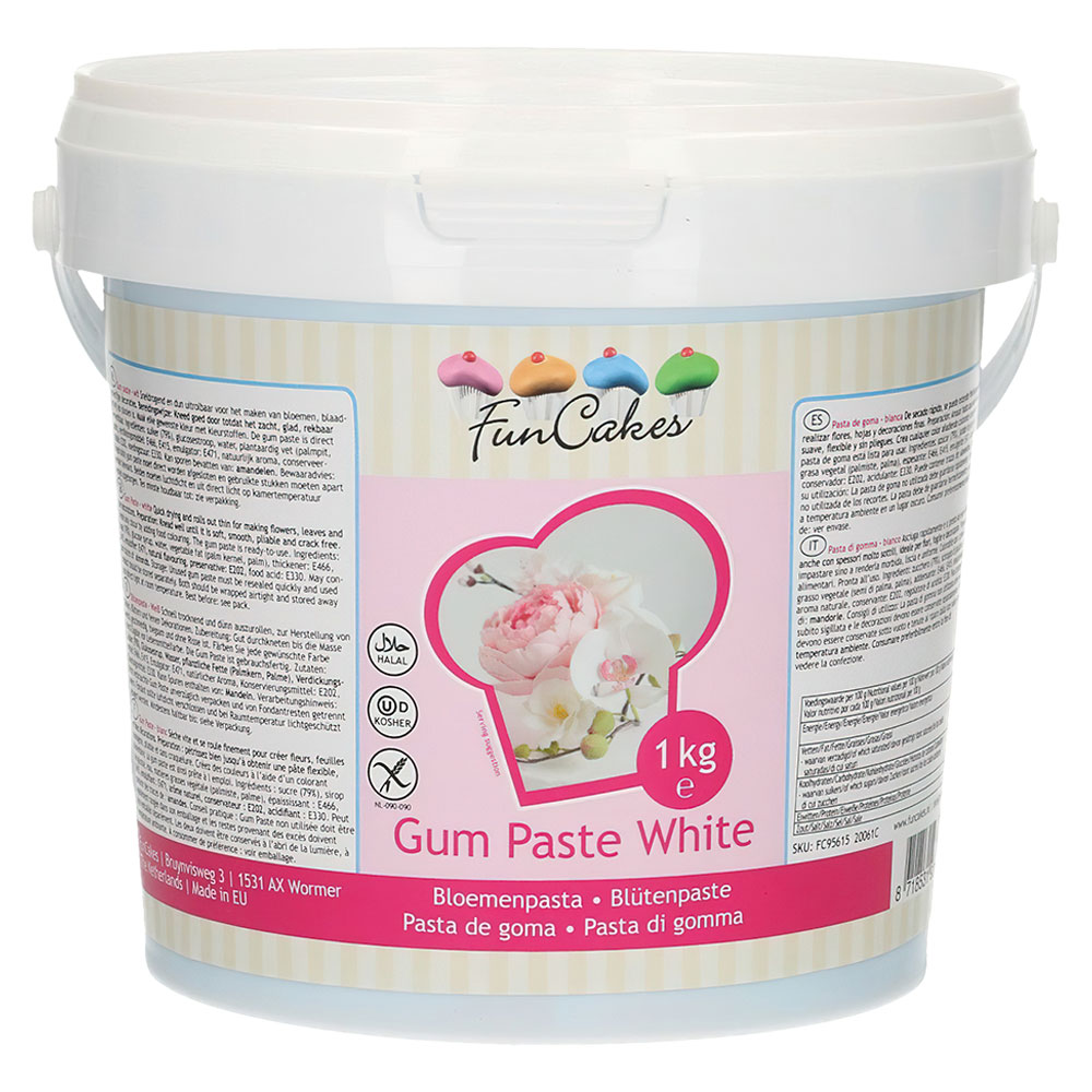 Gum Paste Vit 1 kg omfattar 1 kg vit gum paste som passar till exempelvis ätbara blommor, blad, figurer och liknande. Gum paste är klar att användas direkt från burken och kan även färgas med karamellfärg.