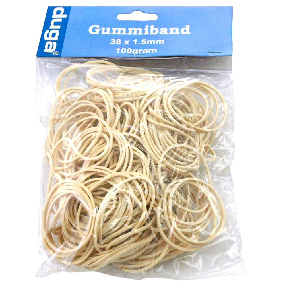 Gummiband omfattar en påse med 100 gram beige gummiband som mäter 1,5 millimeter i bredd och 3,8 centimeter i diameter.