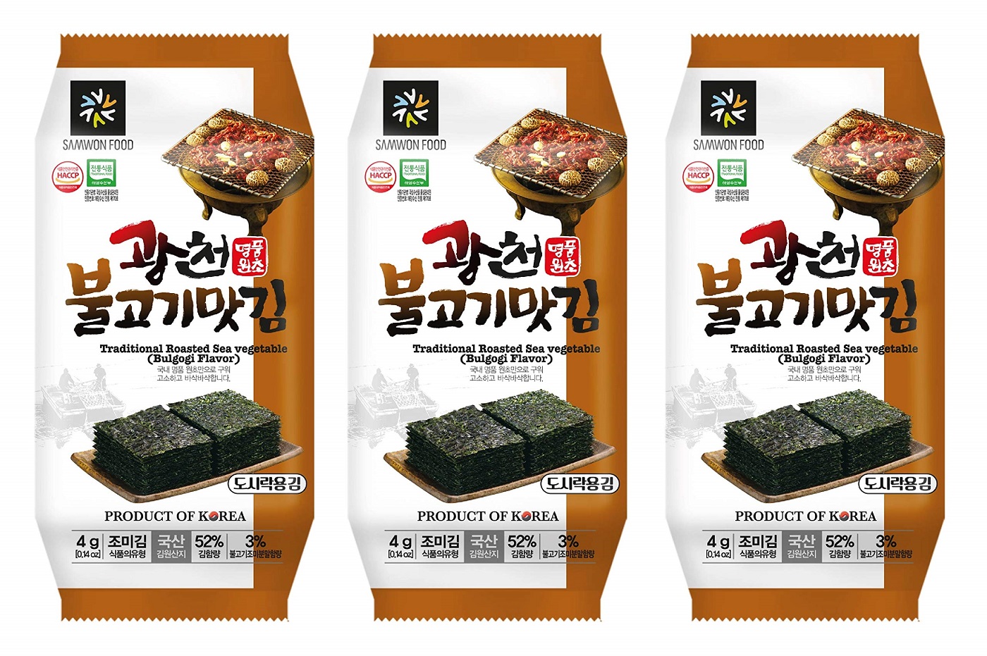 Krispiga och rostade sjögrässnacks från Sydkoreanska Gwangcheon Samwon Food med Bulgogi smak.