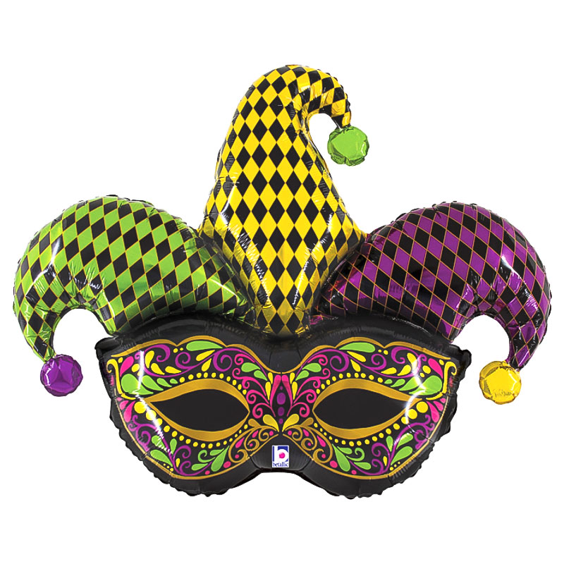 Gycklarmask Folieballong omfattar en folieballong formad som en gycklarmask. Fylls med luft eller helium.