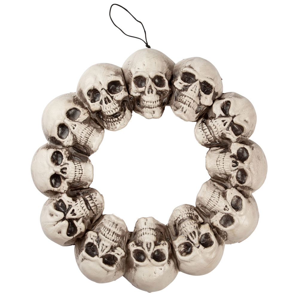 Halloween Dörrkrans Dödskallar omfattar en dörrkrans som består av dödskallar med en ögla för upphängning.