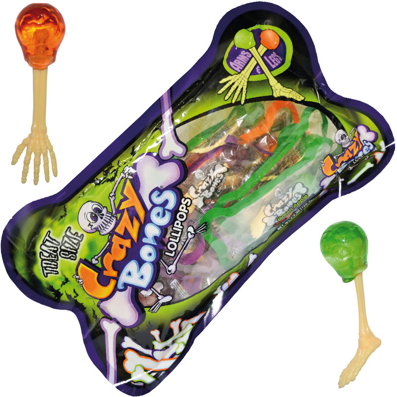 Halloweengodis Klubbor kommer i smakerna äpple, apelsin och vindruva med skaft föreställande skeletthänder- och ben.