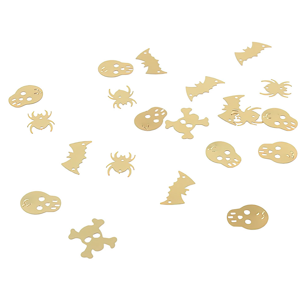Halloween Konfetti Guld omfattar en guldig konfetti mix med tre olika Halloween motiv i form av pumpor, dödskallar och fladdermöss.