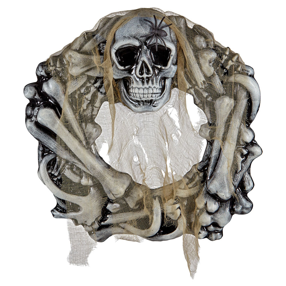 Halloween Krans Skelett omfattar en halloween krans med ett skelett, en svart spindel och läskigt tyg. Kransen är i plast och mäter ca 50 cm i diameter.