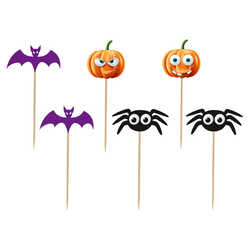 Baka en spindelkaka eller bjud på skrämmande goda snittar och sätt dessa party picks i toppen, perfekt Halloween dekoration till tårta och appertiff. Dessa toppers blir en skojig tårtdekoration, perfekt pynt till Halloween-dukning för alla barn och vuxna som vill ha en rolig Halloween dekoration till maskerad och party.