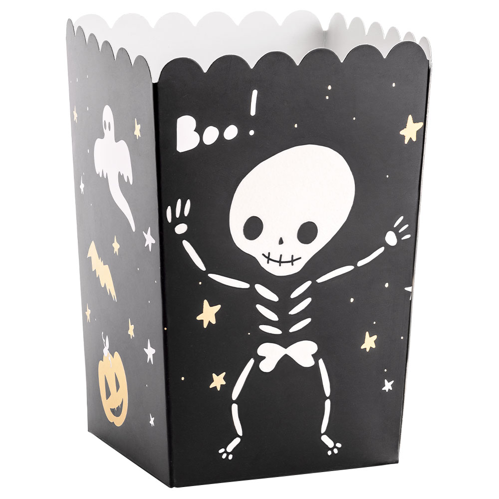Halloween Popcornbägare 6-Pack omfattar sex stycken svarta engångsbägare för t.ex. popcorn med olika halloween motiv som spöke, skelett, fladdermus och pumpa.