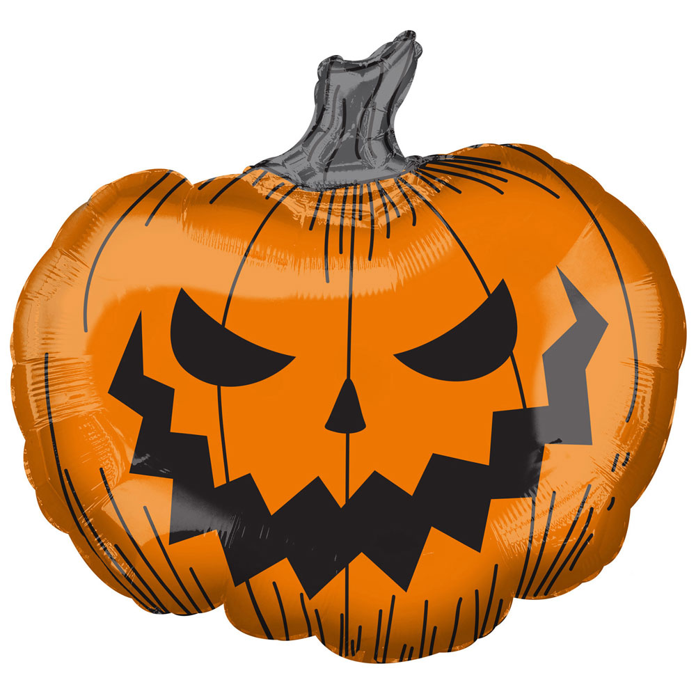 Halloween Pumpa Ballong Folie innehåller en stor folieballong i form av en orange Halloween pumpa med läskigt ansikte. Ballongen kan fyllas med luft eller helium. Tillverkad av folie.