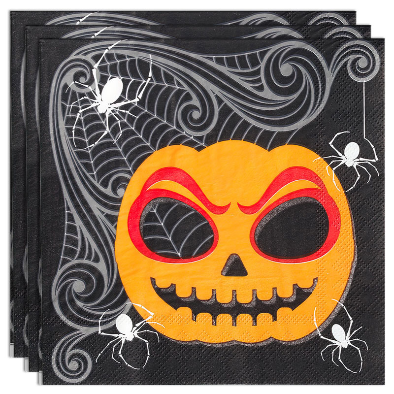 En ultimat halloweendukning kräver också sina servetter, och vad passar bättre än en lömsk pumpa i klassisk Halloween manér? Dessa Halloween servetter blir ett kul och enkelt pynt, en lagom skrämmande dekoration för en läskigt skojig Halloween fest. Maxa firandet med andra läskiga Halloween dekorationer, för ett riktigt halloween firande!