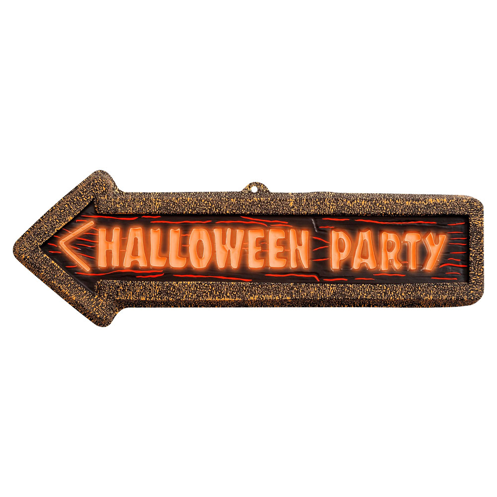 Halloween Party Skylt omfattar en plastskylt i form av en pil med texten "Halloween Party". Skylten är ca 56 cm lång och 17 cm bred och har en liten ögla upptill för enkel upphängning.