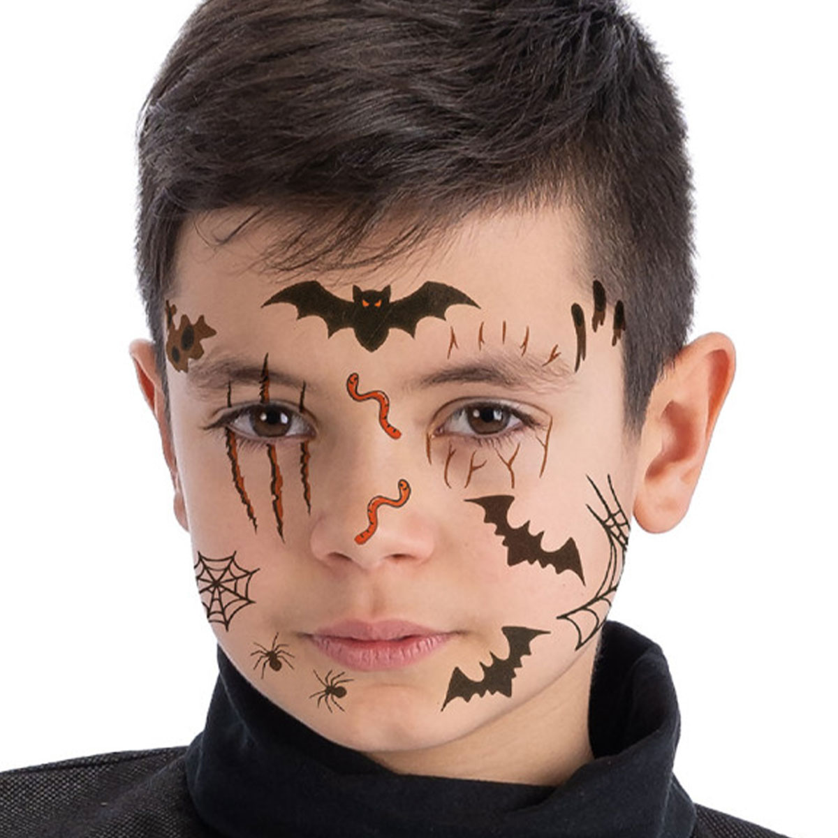 Halloween Temporära Ansiktstatueringar omfattar ett ark med 15 st temporära ansiktstatueringar som har olika Halloween motiv.