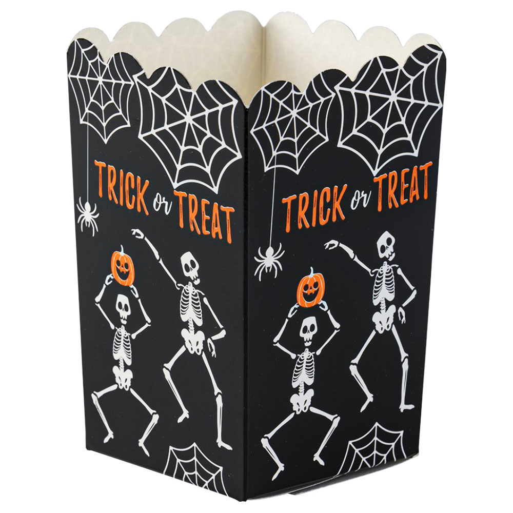 Ska du bjuda på smarriga snacks under halloweenfesten så kan du göra det både enkelt och riktigt snyggt med hjälp av dessa tjusiga halloween engångsbägare! Festliga snacksbägare i svart med motiv av skelett och texten "Trick or Treat", vilket passar helt perfekt till varje halloweenfirande. Kort sagt utmärkta popcornbägare till halloweenfiranden för både barn och vuxna.
