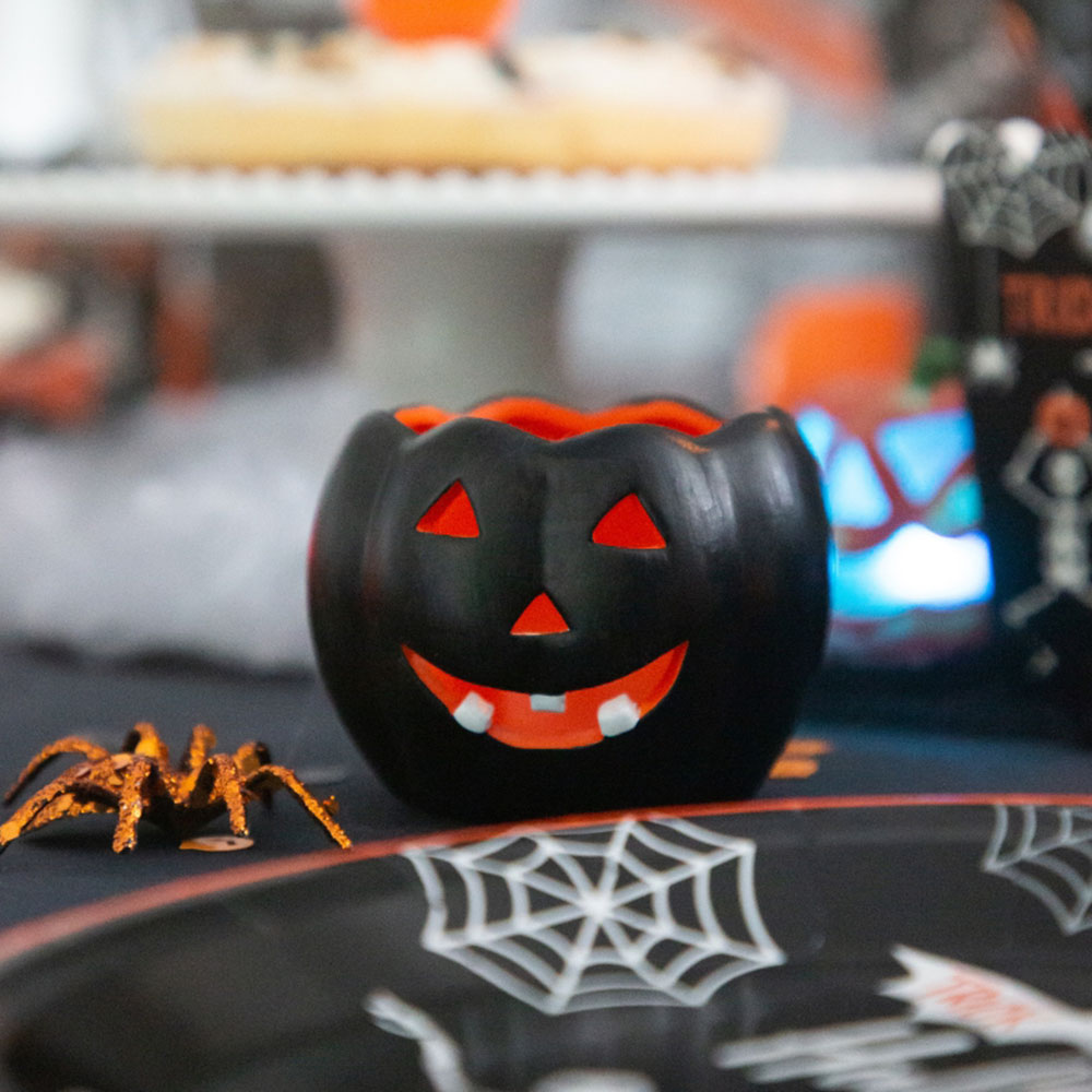 Halloweenpumpa Ljuslykta Liten Svart omfattar en liten värmeljuslykta i form av en halloweenpumpa med orange insida och svart utsida.
