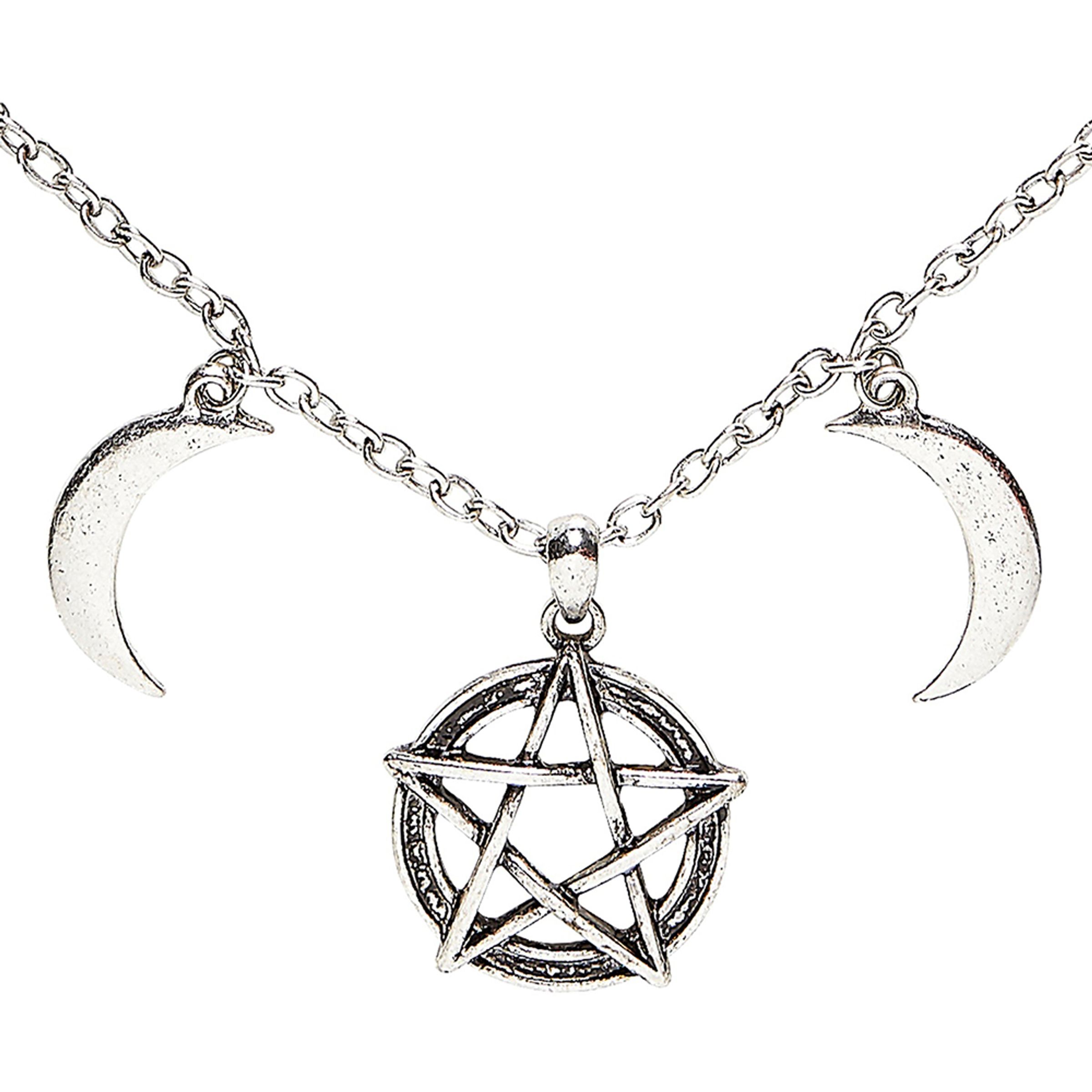 Detta halsband ser ut som svartkonsten själv. I den silvriga kedjan hänger två halvmånar och en stjärna i en cirkel. En snygg accessoar som passar bra till exempelvis halloween och när du vill ge din outfit det där lilla extra.