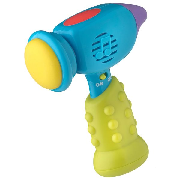 Hammare med Ljus & Ljud omfattar en leksak i form av en hammare i grön, lila, blå och rosa som spelar fyra ljud och har en inbyggd LED-lampa.