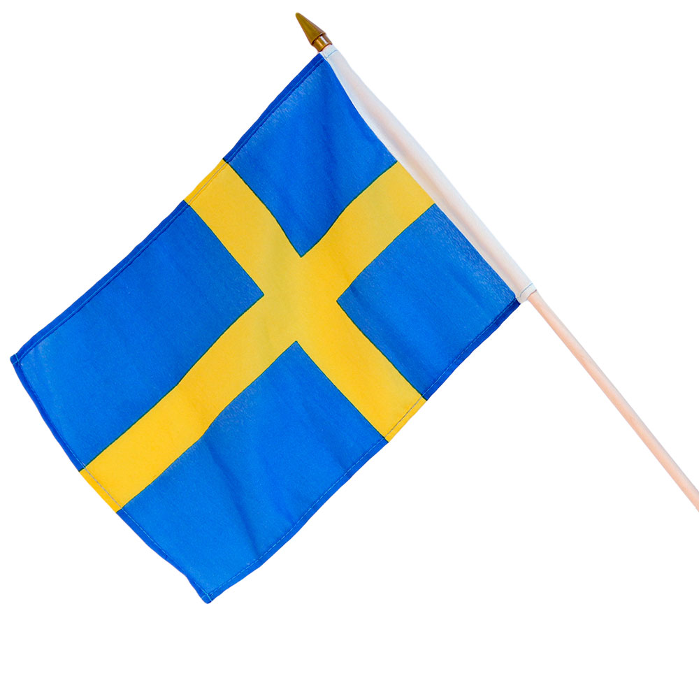 Handflagga Sverigeflagga består av en svensk handflagga gjord av plast och polyester samt en 60 cm lång pinne i trä. Flaggan är ca 20 cm bred och 30 cm lång.