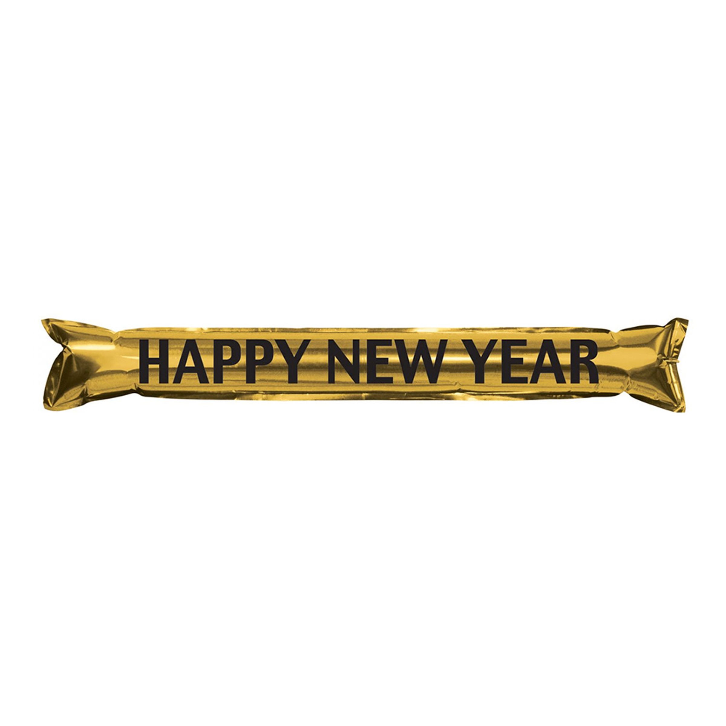 Handklappor Happy New Year Guld/Metallic inkluderar två stycken guldfärgade handklappor. På handklapporna står det "Happy New Year" med svarta bokstäver. Du blåser enkelt upp dem med ett litet rör som medföljer. När du klappar dem uppstår ett starkt ljud som hörs lång väg. De är tillverkade i plast och är ca 56 cm.
