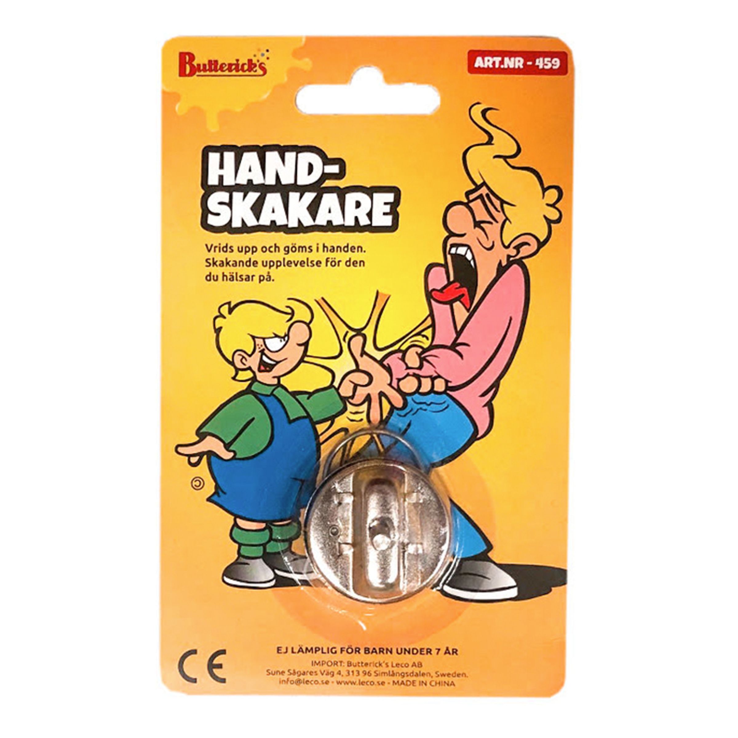 Handskakare Skämtartikel är en klassisk skämtartikel. Du vrider enkelt upp handskakaren och gömmer den i din hand. Nästa person du hälsar på kommer att få känna av ett riktigt skakigt handslag. Skämtartikeln är inte lämplig för barn under sju år.